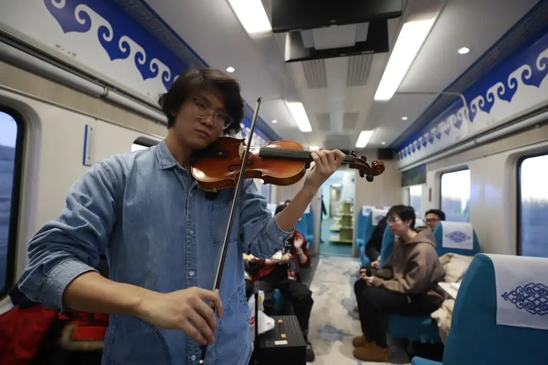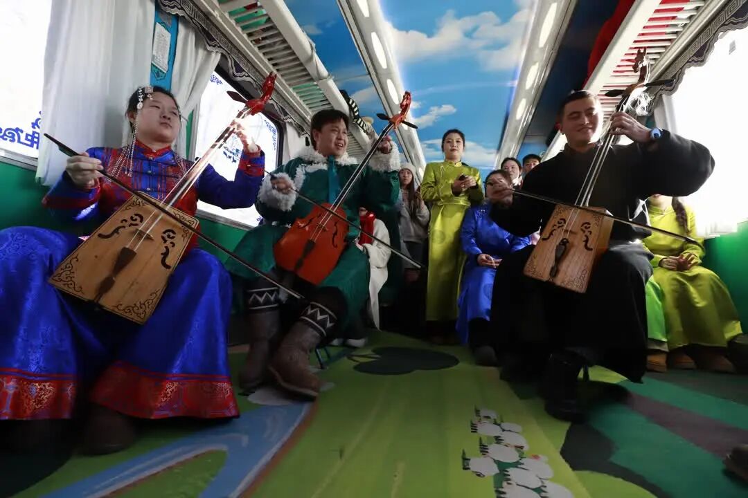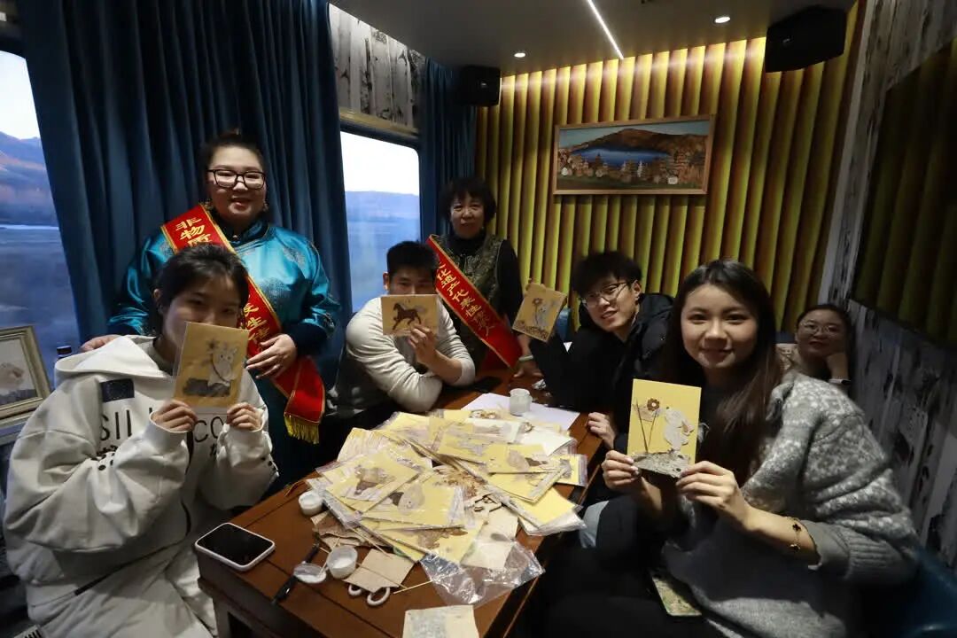 1月24日清晨,一列復(fù)古綠皮車——“阿爾山號(hào)”主題列車緩緩駛出,化身為移動(dòng)的文化課堂。車廂內(nèi),20世紀(jì)六七十年代的舊報(bào)紙、老式行李架與窗外的霧凇雪景交相輝映。烏蘭牧騎演員悠揚(yáng)的馬頭琴聲在車廂回蕩,非遺傳承人手把手指導(dǎo)學(xué)生們剪出草原紋樣的窗花、創(chuàng)作白樺樹(shù)皮畫。作為“興安盟旅游推薦官”,這百名學(xué)子不僅是體驗(yàn)者,更是傳播者?;顒?dòng)首晚,興安盟文化旅游體育局為他們頒發(fā)聘書,鼓勵(lì)大家通過(guò)小紅書、B站、微博等平臺(tái),以Vlog、圖文攻略等形式,向全網(wǎng)展示興安盟的冬日盛景。